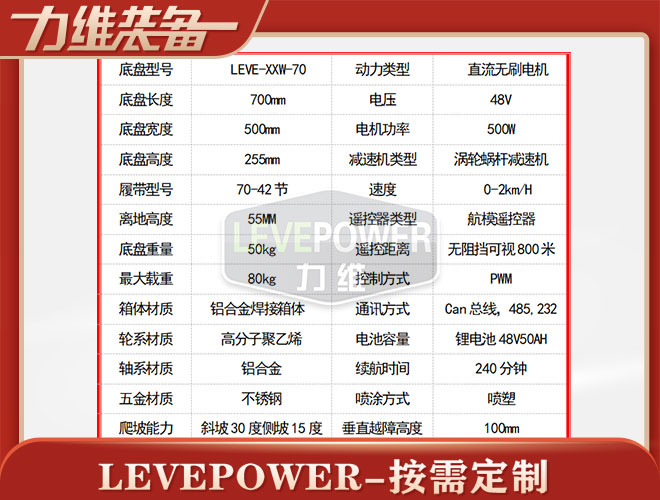 履帶底盤長(zhǎng)700mm,履帶底盤寬500mm,履帶底盤高255mm,無(wú)線遙控履帶底盤箱體采用鋁合金材質(zhì)焊接而成,防腐性能好。履帶底盤動(dòng)力采用48V500W直流無(wú)刷電機(jī),渦輪蝸桿減速機(jī)動(dòng)力更強(qiáng),轉(zhuǎn)彎靈活,爬坡性能穩(wěn)定。履帶底盤電池采用48V50AH鋰電池,續(xù)航時(shí)間更長(zhǎng),是一款不錯(cuò)的機(jī)器人橡膠履帶。