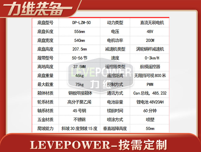 橡膠履帶底盤長556mm,橡膠履帶底盤寬540mm,橡膠履帶底盤高207.5mm,無線遙控履帶底盤采用48v200W直流無刷永磁電機(jī),渦輪蝸桿減速機(jī)動力更強(qiáng),轉(zhuǎn)彎靈活,操控簡單。履帶底盤電池采用48V20AH鋰電池續(xù)航時間更長。履帶底盤箱體采用鋼板焊接而成,輪系采用高分子聚乙烯,履帶底盤整體重量輕,耐磨性強(qiáng)。